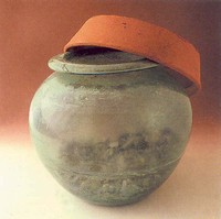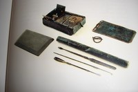 d'oculiste Elle a été découverte dans une tombe à incinération d'une nécropole du quartier TRION entre 1983-1985 (500 tombes ont été fouillées) Déposée à coté des cendres du défunt , elle etait composée d'un coffret,d'un étui et d'une tablette.Le coffret est creusé en coupelle permettant de dissoudre les collyres broyés dans de l'eau et du lait. L'étui contient 3 spatules destinées à préparer les collyres et à les appliquer dans l'oeil . Les analyses ont révélé des proportions importantes d'oxydes métalliques et de pollens , ce qui est pour le moins surprenant ! |